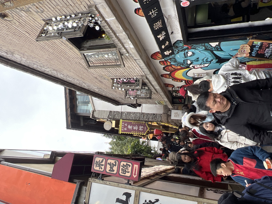 A bustling alleyway filled with people navigating between buildings. Above, ornate windows adorn the brick facade, accompanied by hanging decorations. Colorful signs in East Asian characters line the shops. The crowd appears diverse, with individuals in various styles of clothing. Graffiti art decorates an upper wall, adding to the urban atmosphere.