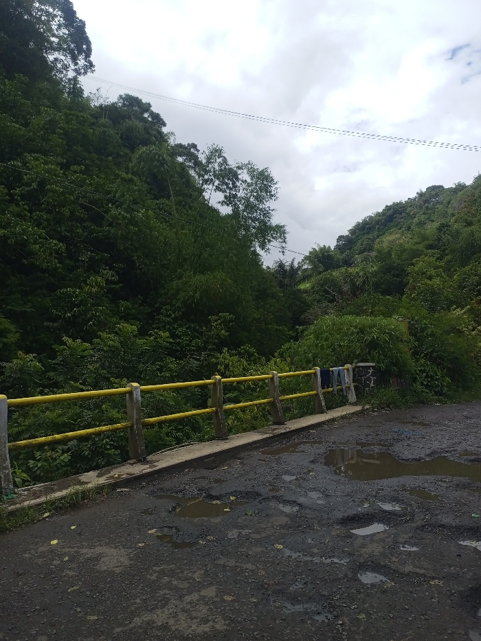 This image depicts a rural scene in Meyong, India, under an overcast sky. The foreground shows a heavily degraded asphalt or gravel road containing numerous potholes, several of which hold standing water. To the left, a concrete bridge with yellow metal railings and light grey posts extends across the frame. Beyond the bridge, dense green vegetation covers steep hillsides that rise on both the left and right, forming a valley or gorge. Various trees, including bamboo, comprise the foliage. Above the hills, multiple thin, dark power lines are visible against the cloudy sky. On the right side of the bridge, two items of clothing, a dark blue garment and a lighter-colored one, are draped over the yellow railing. Behind these items, a dark stone structure or wall is partially visible amidst overgrown shrubs. No individuals or active interactions are present in the scene.