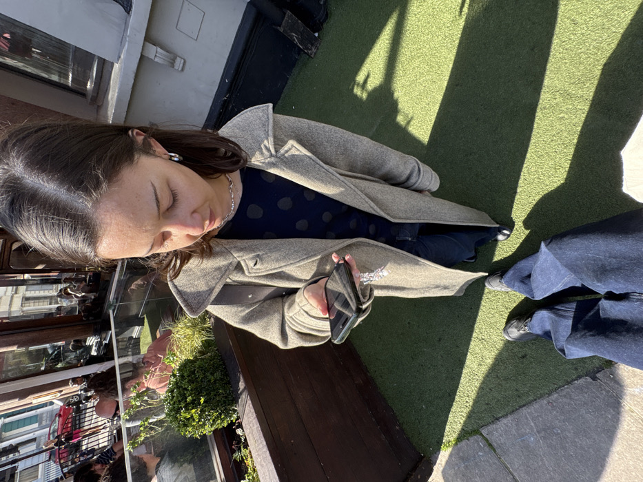 The image depicts a high-angle, low-perspective view of a woman standing on green artificial turf, likely an outdoor seating area. The woman, with dark brown hair exhibiting some grey roots, wears a light brown or grey wool coat over a dark blue polka-dotted top and dark blue jeans. A silver-toned necklace and a hoop earring in her left ear are visible. She holds a black smartphone horizontally in her left hand, looking down at the screen. A white charm or keyring with multiple elements is attached to the phone. To the left, a dark wooden planter box contains green shrubs. Behind the woman and the planter, a large glass window reflects the interior of a commercial establishment (likely a pub or restaurant) with seated patrons and tables, as well as exterior street elements including building facades, a red vehicle, and other pedestrians. The lower portion of the frame shows the legs and feet of the photographer, also wearing dark blue jeans and dark shoes, standing on the same artificial turf next to a dark grey curb. Strong sunlight casts distinct shadows across the turf. The architectural style and urban setting are characteristic of London, United Kingdom.