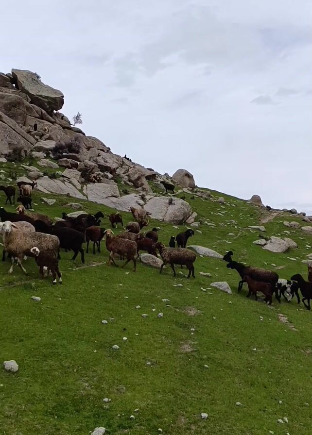 flock of sheep grazing on a lush green hillside dotted with large boulders. The sheep are varied in color, including black, brown, and white, and range in size from lambs to adults. The hillside slopes upward, with a cluster of large rocks forming a prominent feature at the top. The sky is overcast, creating a soft, diffused light. The sheep are scattered across the hillside, some grazing and others moving around. A few sheep are bleating.