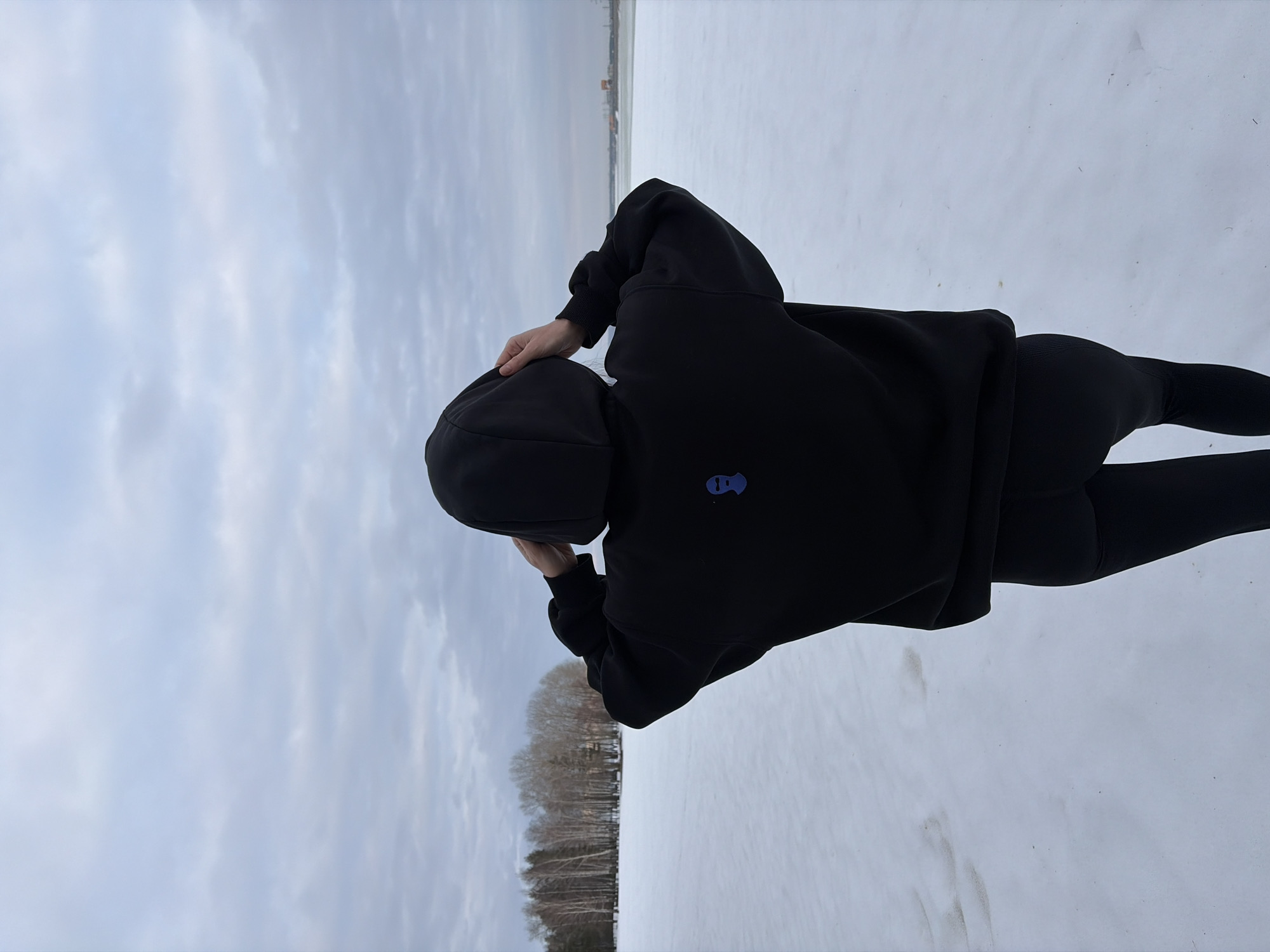 The image depicts a lone individual standing on an expansive, snow-covered plain, facing away from the viewer, presumably in the vicinity of Noviy, Russia. The individual, dressed in a black oversized hooded sweatshirt with the hood pulled over their head and black form-fitting lower garments, has their hands positioned at the sides of their head, appearing to adjust the hood. A small blue emblem, stylized as a balaclava or ski mask, is visible on the upper back of the sweatshirt. The ground is uniformly covered in white snow with isolated patches of exposed earth or discolored snow visible in the foreground. The sky is overcast with a consistent light gray cloud cover. In the middle distance to the left, a line of bare deciduous trees and some evergreen trees mark a forest edge. To the far right horizon, a large body of water, likely frozen or partially frozen, is visible, beyond which lie distinct industrial structures, including what appear to be power lines or components of a dam. The scene conveys a cold, wintry or early spring environment.