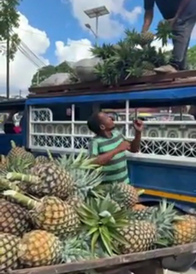- "Two men are loading pineapples from the roof of a small blue truck to a small trailer" by FM-ohOUo2, licensed under CC BY 4.0