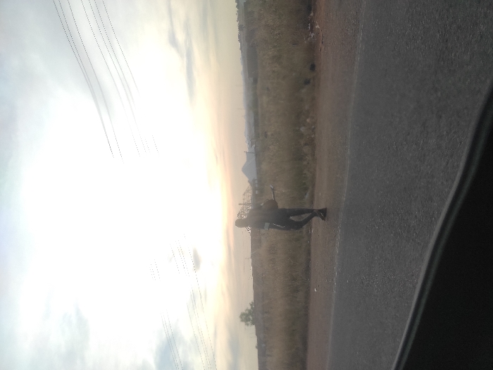 An outdoor image shows a person walking along a road near tall, dry vegetation. The horizon is marked by a blend of light and muted colors, possibly during sunrise or sunset. Overhead, power lines stretch across the sky. The image is partially obscured by what appears to be a dark interior or frame, possibly taken from inside a vehicle.