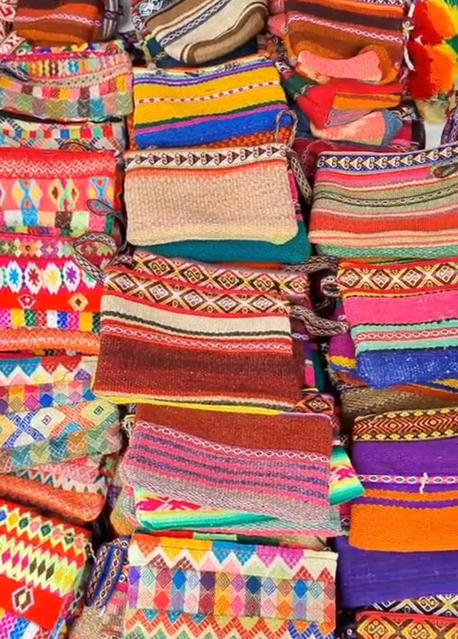 close-up, stationary shot of a colorful display of handwoven bags and pouches