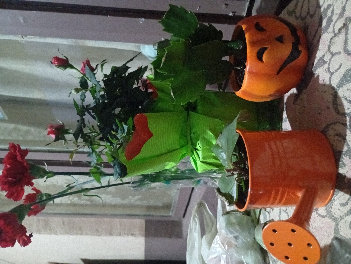 The image displays an indoor still life arrangement on a patterned surface, located in Alfatar, Bulgaria. No individuals are present. On the patterned surface, from left to right, a small leafy plant is contained within an orange metal pot shaped like a miniature watering can. Adjacent to it is a succulent plant housed in an orange ceramic pot designed as a jack-o'-lantern with a black carved face. Behind these, a potted plant featuring multiple red rose buds and green foliage rests, its base wrapped in bright green paper with a red top edge. To the left and slightly further back, a clear glass vase holds several red carnations with green stems. The background consists of a window partially obscured by light-colored curtains and a crumpled white plastic bag visible on the surface to the far left. The scene is illuminated by ambient indoor light.