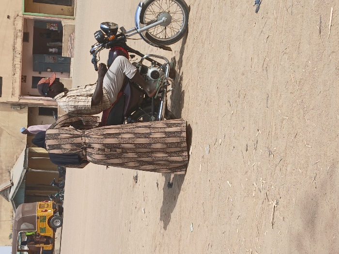 The image depicts an outdoor scene on an unpaved, sandy thoroughfare in Gayawa, Nigeria