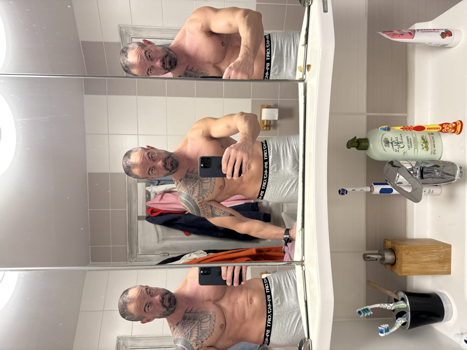 This image depicts a bathroom interior located in Marche-en-Famenne, Belgium. A shirtless, muscular adult male with a short beard and prominent dark tattoos covering his left shoulder and arm is positioned centrally, taking a mirror selfie with a dark-colored smartphone held in his right hand. He wears grey boxer briefs with the waistband displaying "SPORT.GAS-98" in white lettering. His left arm is bent, and a dark smartwatch is visible on his left wrist. He maintains a serious facial expression, looking directly into the camera/mirror. The scene is reflected in a multi-panel mirror positioned above a white bathroom vanity. The reflections show the man from various angles. In the background, behind the central reflection of the man, a light-framed door is partially visible, obscured by several garments (red, orange, pink fabrics) hanging from it. The wall tiles are light beige/grey. To the right of the central reflection, a wooden toilet paper holder with a white roll is mounted on the wall. On the white vanity countertop below the mirror, various bathroom items are arranged around a silver faucet in the sink basin. These include: a black container holding two manual toothbrushes and one electric toothbrush; a bamboo-encased soap dispenser with a silver pump; a freestanding white and blue electric toothbrush; a bottle of "Le Petit Olivier Lait Corps Hydratant Huile d'Olive" hand lotion; a red and yellow children's toothbrush; and a pink toothpaste tube with a strawberry graphic. Two circular ceiling lights are reflected in the upper portion of the mirror.