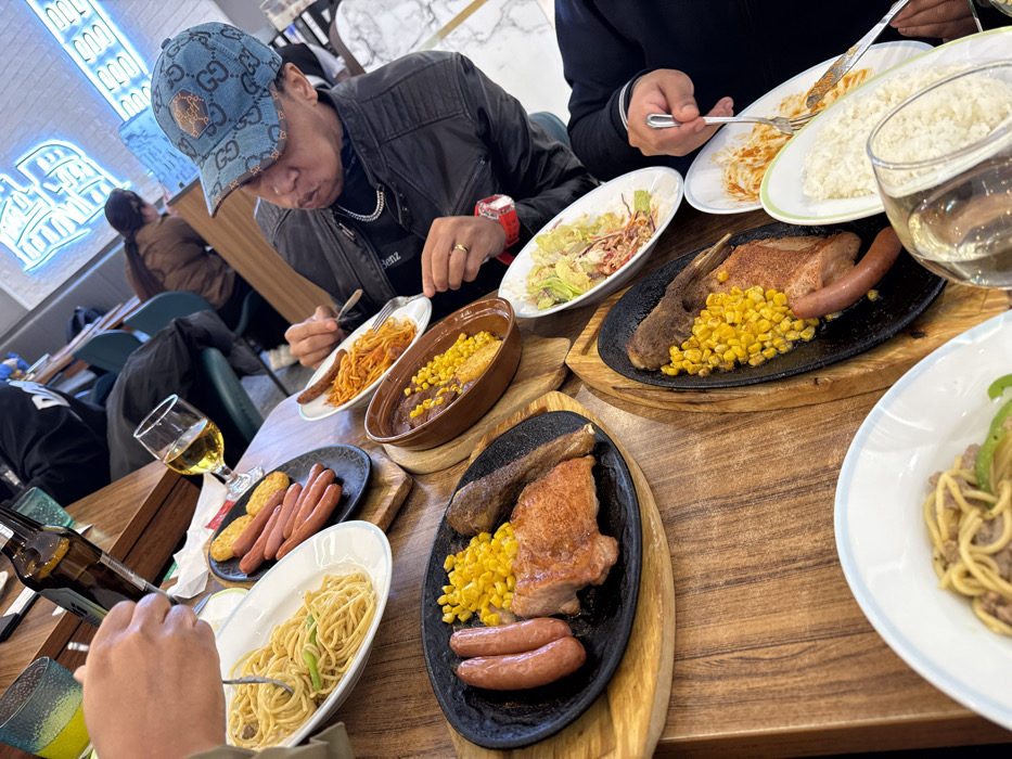 The image depicts an indoor dining scene within a restaurant located in Daxing District, China. A wooden table occupies the foreground, laden with various dishes and beverages. Three individuals are partially visible at the table. On the left, a person's hands and forearms are seen manipulating spaghetti with a fork from a white oval plate. In the mid-right, a male subject wears a black leather jacket, a dark shirt, a silver chain, and a blue patterned baseball cap, with a red-banded watch on his left wrist, looking down at a white oval plate containing spaghetti, holding a fork. On the far right, another person's hands and forearms are visible, using a fork on a plate of white rice. The table features multiple oval black cast iron sizzling platters, each placed on a wooden base. These platters contain a cooked meat portion (appears to be chicken or pork steak), a side of yellow corn kernels, and one or two cooked sausages. Additional dishes include white oval plates of spaghetti (some with green peppers), a mixed green salad, plain white rice, and small circular hash browns. A brown ceramic bowl holds baked beans mixed with corn. Beverages include a stemmed glass containing an amber liquid (likely beer), a dark green glass with a yellow-green beverage, a clear glass of water, and a brown glass bottle. In the background, other blurred patrons are seated at tables. A white brick wall is visible, featuring a blue neon sign displaying illuminated Chinese characters. The overall scene shows active dining.