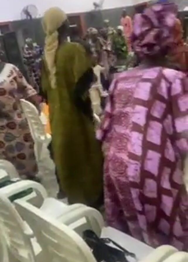 people dancing in what appears to be a church. Many people are wearing colorful, traditional African clothing. Some of the people are dancing in place or moving around the room. There are rows of white plastic chairs filling much of the space. A child can be seen dancing with enthusiasm. A man in a white shirt stands on a stage area in the background. There are speakers on the stage. The video is slightly shaky.
