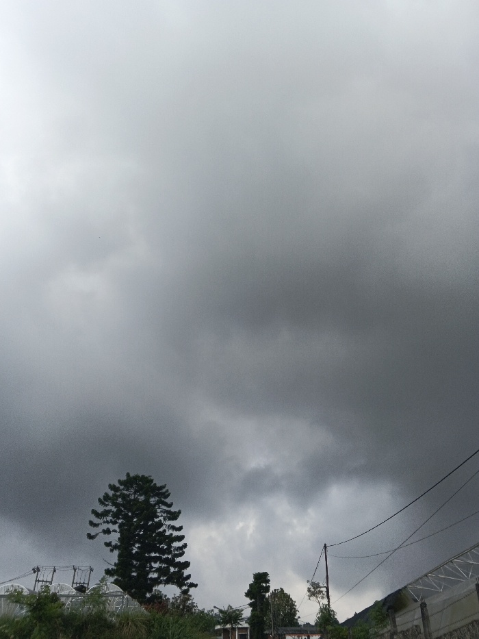 A gloomy scene under a heavy, overcast sky filled with thick gray clouds. In the lower portion, verdant foliage and a tall evergreen tree anchor the landscape. Structures resembling greenhouses or agricultural facilities are visible among the vegetation. Power lines run across the scene. The overall impression is one of impending rain or a heavy storm.