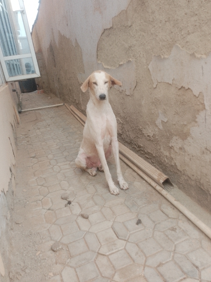 - "A medium-sized, light-colored dog with tan markings on its head and ears is sitting on a tiled patio between a building and a peeling wall" by FM-FdDfz1, licensed under CC BY 4.0