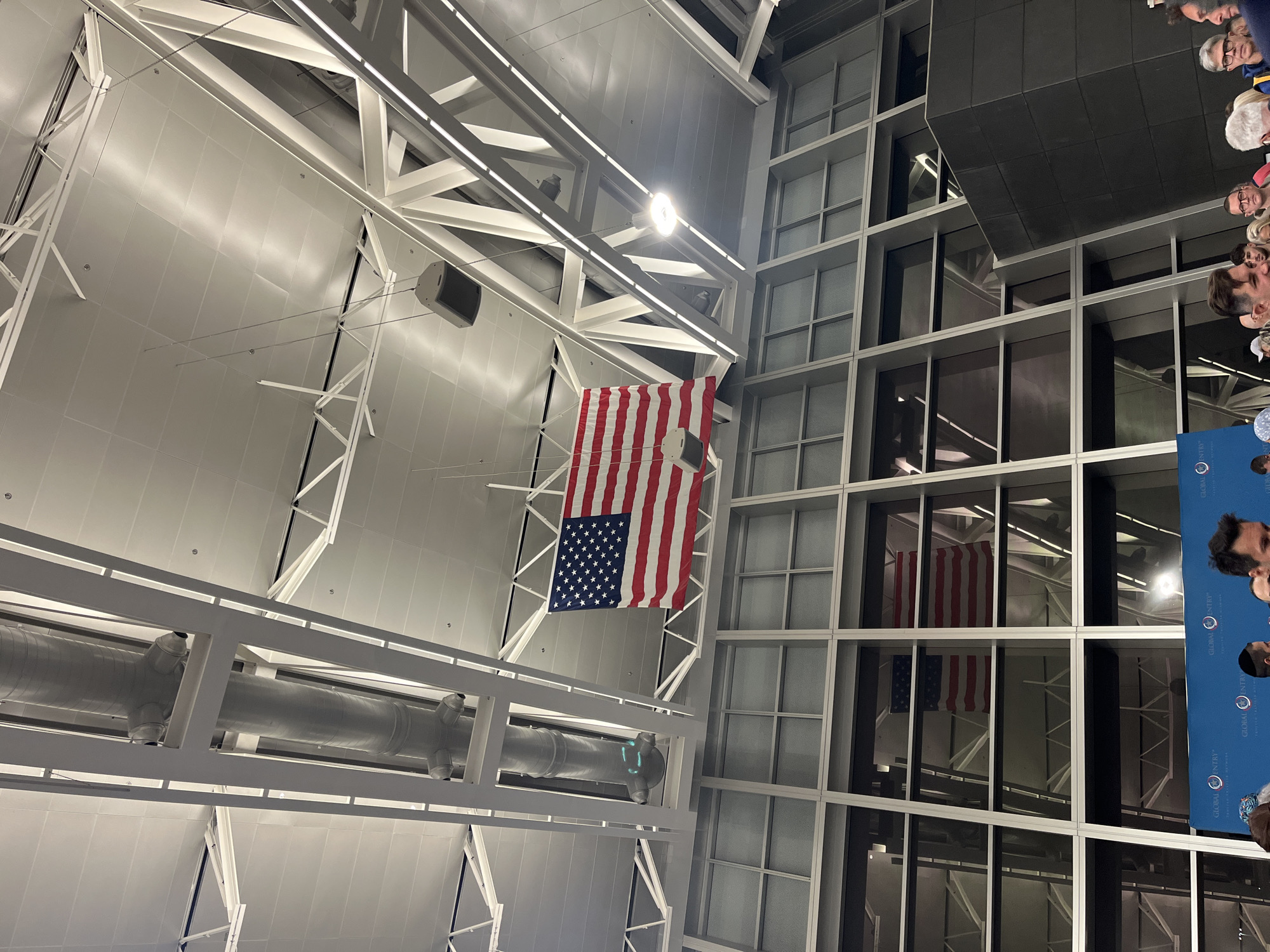 This image depicts the interior of an international airport terminal or a customs processing facility in the city of Unknown, Unknown. The scene is dominated by a high, modern ceiling constructed with grey panels, exposed white structural trusses, large cylindrical grey air ducts, and numerous embedded and suspended artificial light fixtures, including bright spotlights and linear LED strips. Several grey box-shaped speakers are also suspended from the ceiling. A large American flag hangs centrally from the ceiling, displaying its 50 stars and 13 stripes, with some minor creasing visible on its fabric. Below the flag and extending across the mid-ground is a vast multi-paned glass wall, reflecting elements of the interior, including the American flag. To the right of the glass wall, a dark, rectilinear architectural feature, possibly a column or service structure, is present. In the lower foreground, a crowd of approximately 15-20 individuals is partially visible from the shoulders up, mostly facing away from the camera or towards an unseen focal point. Their attire is casual. Directly below this crowd, a blue banner bearing the text "GLOBAL ENTRY NETWORK" is partially visible. The overall lighting is bright and artificial.
