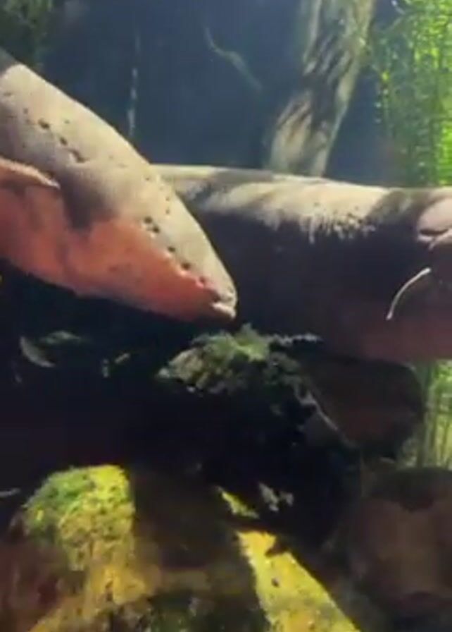 two electric eels in an aquarium. The eels are large and dark brown in color. They are resting on the bottom of the tank among rocks and plants. The water is clear. A small fish swims near one of the eels. A voice is heard saying, "It tastes like cherry?"
