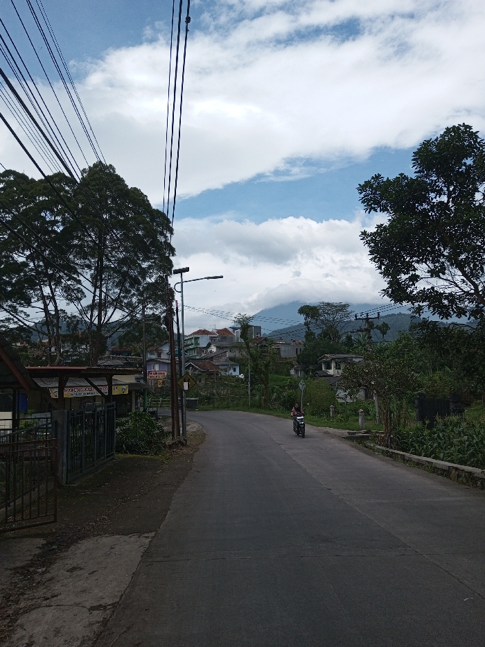 The image depicts a paved road in the city of Ariyalai, Sri Lanka, winding through a hilly, semi-urban landscape. In the foreground, a dark asphalt road occupies the center, flanked on the left by a dirt and concrete shoulder with an open metal gate and a structure featuring signs, including text in Indonesian such as "WARUNG MAKAN." Numerous overhead utility wires and a utility pole with a streetlight extend across the upper left and mid-left frame. A single individual, wearing a dark jacket and helmet, is riding a dark-colored motorcycle away from the camera, positioned on the right side of the road as it curves to the left. The midground features a mix of lush green trees, including tall, slender conifers on the left and broadleaf trees on the right, interspersed with residential buildings on hillsides. Distant mountains, partially shrouded by white clouds, form the backdrop under a sky with patches of clear blue and scattered white cumulus clouds.
