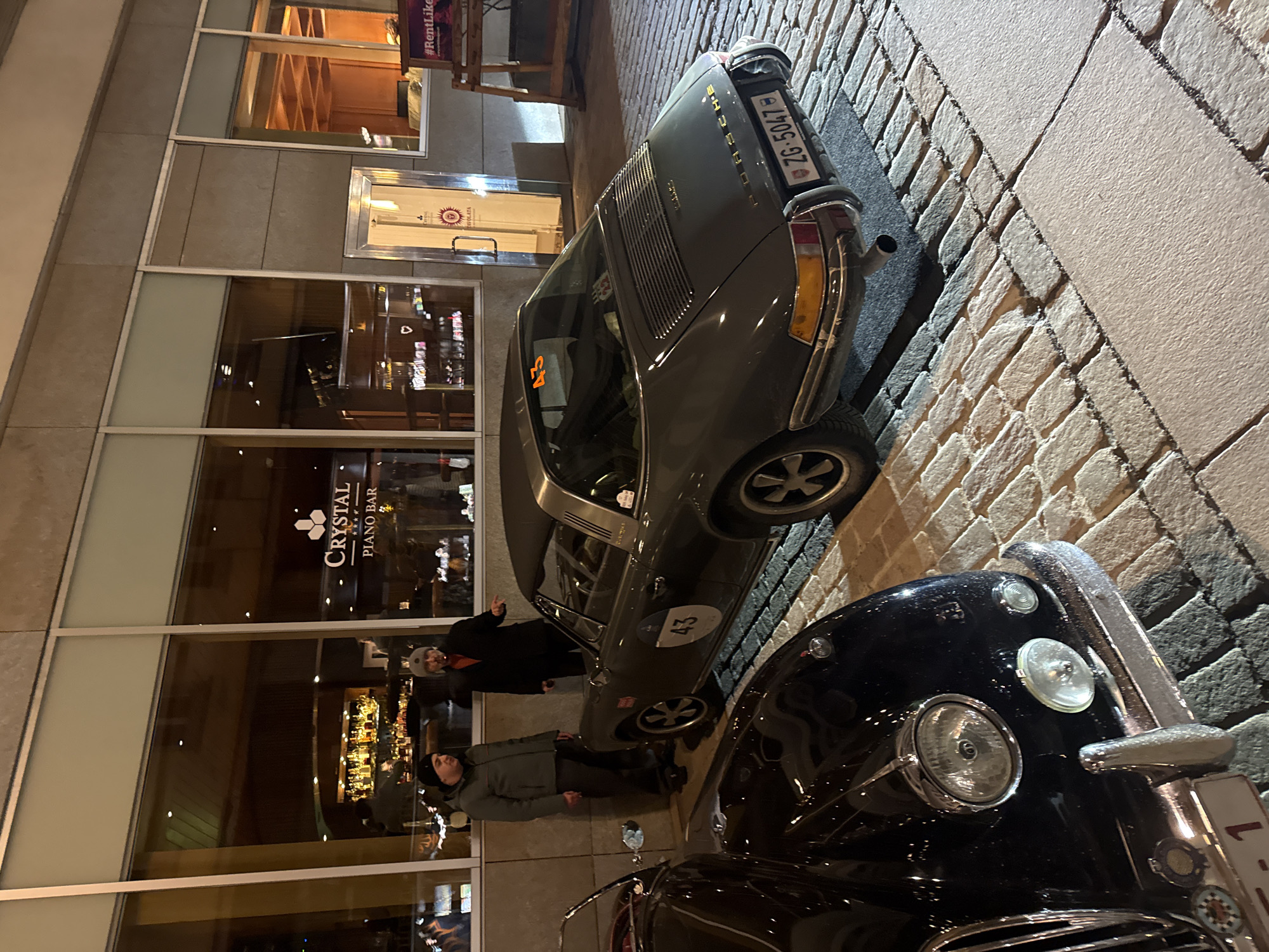 The image captures an evening scene in Sankt Moritz, Switzerland, on Via Maistra 25, in front of the Crystal Piano Bar, part of the Crystal Hotel. In the foreground on the left, the front section of a dark-colored classic automobile is visible. It features prominent chrome-ringed headlights, a chrome bumper, and a partial view of its grille. A white rectangular plate with a red number "1" is partially observable below the bumper. In the midground, a dark grey Porsche 911 Targa is parked, angled with its rear towards the viewer. The car displays a white circular "43" on its driver's side door and an orange "43" sticker on its rear window, indicating participation in an event. It bears a Swiss license plate, "ZG-5047." The vehicle has a black Targa roof panel, a louvered engine cover, and chrome wheels with black centers. Two adult males are standing on the paved sidewalk between the building facade and the Porsche. The man on the left wears a dark beanie and a dark green jacket, standing with his hands in his pockets. The man on the right wears a light grey beanie with ear flaps, a dark jacket, and an orange neck garment, and is gesturing with his right hand towards the Porsche while facing the other man. Behind the individuals, the Crystal Piano Bar is visible through large, rectangular glass windows. The interior is illuminated, revealing a well-stocked bar with numerous liquor bottles. A lighted sign displaying "Crystal Piano Bar" and three stars is prominent. To the right of the bar windows, a silver-framed glass door is marked with "TAVOLATA" and a stylized sun logo. Further right, a wooden display stand with partially visible text, possibly "#RentLike", is situated on the sidewalk. The ground surface consists of light-colored cobblestones in the street and a smoother, lighter paved section for the sidewalk adjacent to the building.