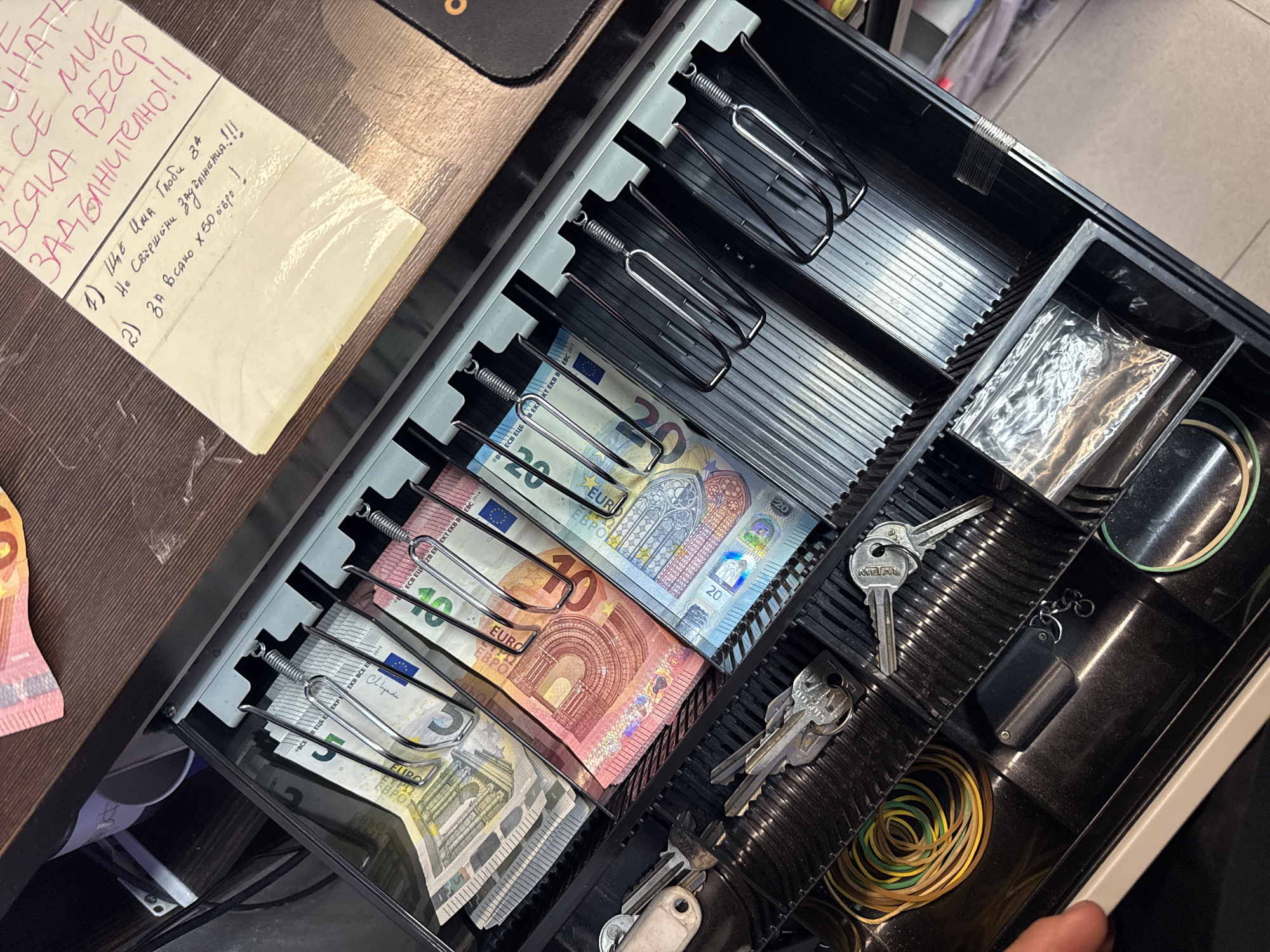 n open cash register drawer containing Euro banknotes of various denominations (5, 10, and 20 Euros). The drawer also holds keys, rubber bands, and plastic bags. A handwritten note in Bulgarian rests on the counter beside the drawer. The note mentions fines and incomplete tasks. While the image itself doesn't confirm it's in Plovdiv, Bulgaria, the Bulgarian text suggests it could be in Bulgaria.