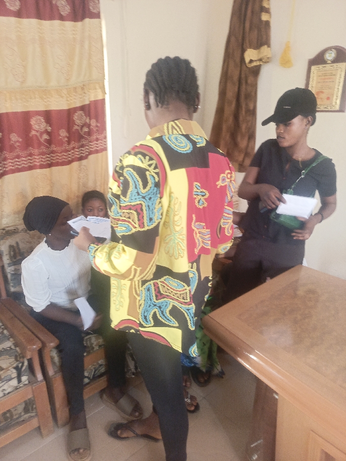An indoor scene in Akwanga, Nigeria, depicts four individuals within a room. In the center foreground, a person with dark braided hair, wearing a multi-colored patterned long-sleeved shirt and dark trousers, stands with their back to the viewer, facing left while holding white papers. To the left, a person wearing a black head covering and a white long-sleeved shirt is seated on a wooden armchair with patterned fabric upholstery, holding papers. The eyes of a third person are partially visible behind the seated individual. On the right, a fourth person stands, wearing a black baseball cap, a black short-sleeved top, dark trousers, and a green shoulder bag, also holding white papers. A light brown wooden desk occupies the right foreground. The background features red and brown striped curtains with floral patterns on the left wall. The right wall displays a dark brown fabric hanging and a framed plaque. The walls are light-colored, and the floor appears tiled.
