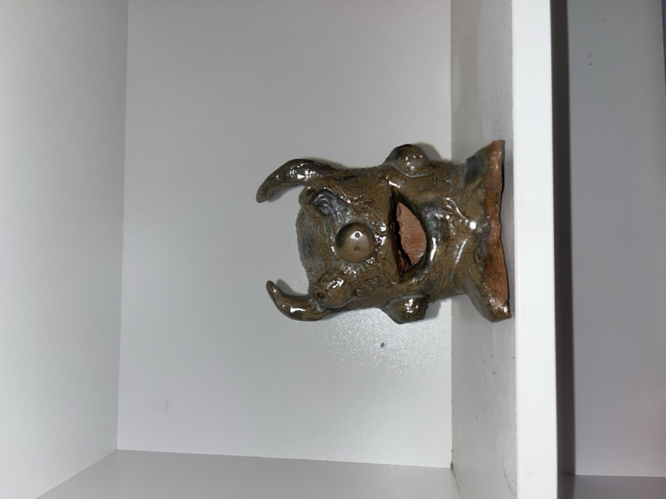 The scene depicts a single, glazed ceramic or clay sculpture positioned centrally on a white shelf
