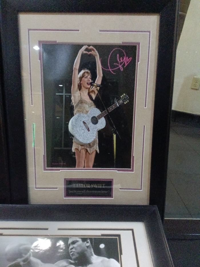A framed and autographed photo of Taylor Swift performing with a guitar and making a heart shape with her hands is on top