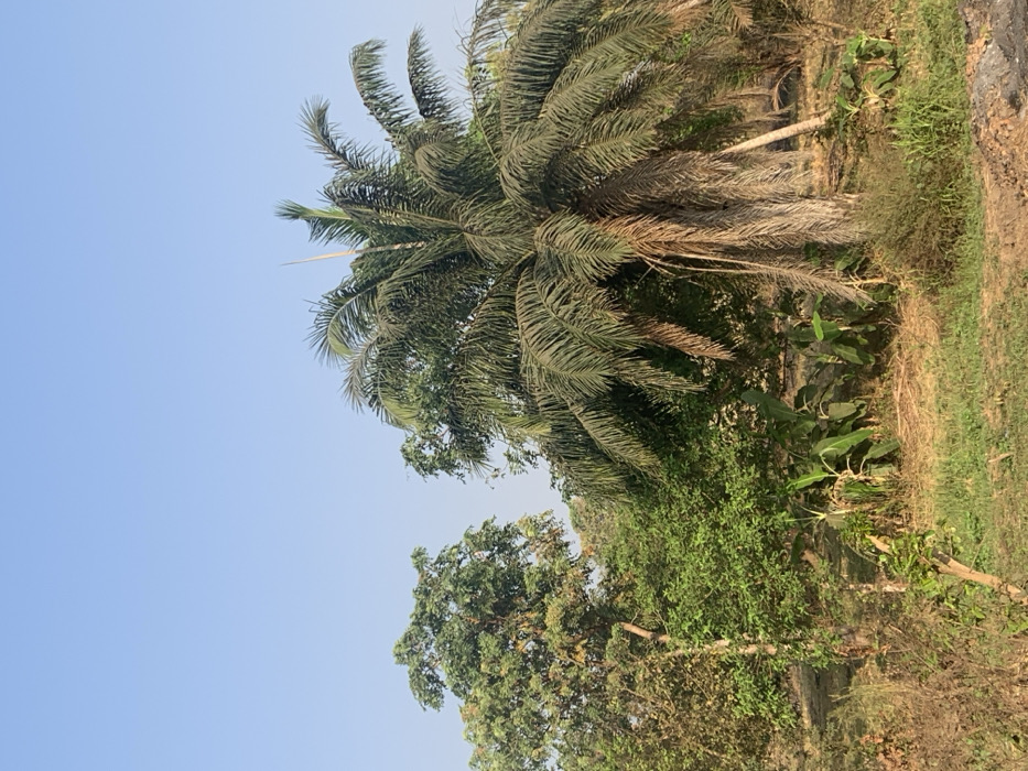 A landscape with diverse greenery under a clear, light blue sky. A tall palm tree dominates the scene, its fronds arching gracefully. Various shrubs and smaller trees cluster below, creating a dense, natural barrier. Grass and leafy plants fill the foreground. The lighting suggests a bright, sunny day, highlighting the textures and shapes of the vegetation.