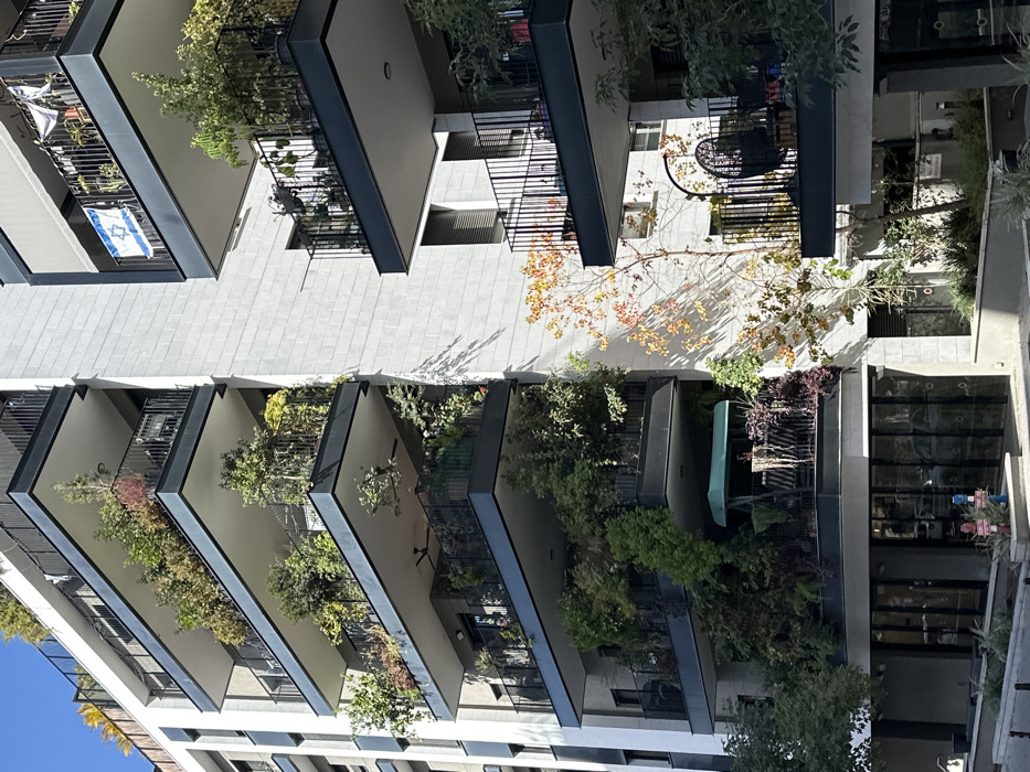 This image displays a modern, multi-story residential building in Givatayim, Israel, under clear daylight conditions. The building features a light-colored, possibly stone-paneled, facade contrasted with dark-colored metal balcony railings. Numerous balconies protrude from the structure, each heavily adorned with a dense variety of green plants, bushes, and small trees, creating a "vertical garden" effect. On an upper-right balcony, a blue and white Israeli flag, featuring the Star of David, hangs prominently from the railing. Visible on the underside of a mid-level balcony on the left stack are two dark-colored ceiling fans. A lower-left balcony includes a green-canopied outdoor swing chair and an adjacent small table with items on its surface. Another lower-right balcony features a black, egg-shaped hanging chair. The ground floor of the building presents large glass storefronts or entrances. The immediate foreground shows a paved area or sidewalk containing small planters with foliage. A slender deciduous tree with sparse, autumn-colored (yellow and reddish) leaves stands in the middle-right foreground, casting elongated shadows across the building's facade. Two small, brightly colored figurines are positioned on the sidewalk in the lower-left. Utility markers, possibly fire hydrants, are visible on the sidewalk in front of the ground-level glass entrance. No individuals are visible.
