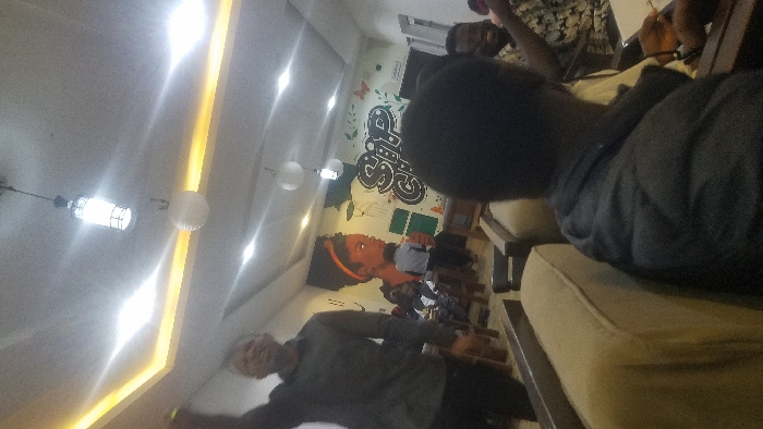The image depicts an indoor gathering, likely within a café or lounge, illuminated by bright overhead artificial lighting, including recessed fixtures, a caged pendant lamp, and white spherical paper lanterns. The rear wall features a large mural: a stylized portrait of a dark-skinned individual with an orange headband, alongside graffiti-style text reading "Sip & Go" surrounded by foliage and butterfly motifs. In the mid-ground, a male individual in a dark long-sleeved shirt stands with his left arm raised. To the right, a partially visible male is seated in a patterned shirt, smiling. In the immediate foreground, the back of a dark-jacketed individual's head is visible, seated in a light-colored upholstered chair. Multiple other individuals are seated at tables in the background. The environment includes light-colored walls and a mix of upholstered and wooden furniture. The location is Unknown, Unknown.