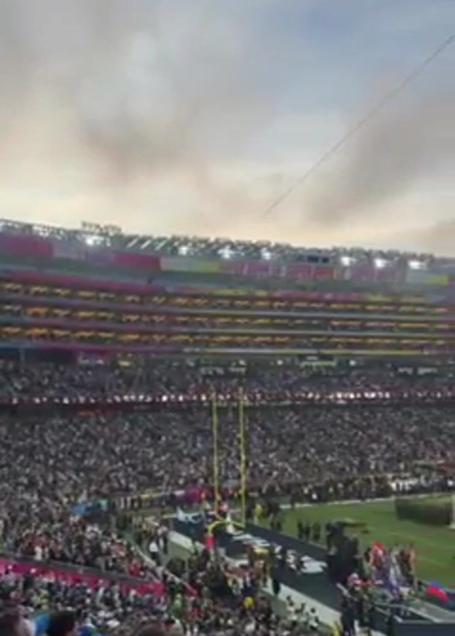 A large crowd fills a football stadium on an overcast day. On the field, a group stands on a decorated platform while music plays. The stadium’s upper deck is visible, with advertising lining the top. The camera captures the atmosphere from the perspective of someone in the stands.