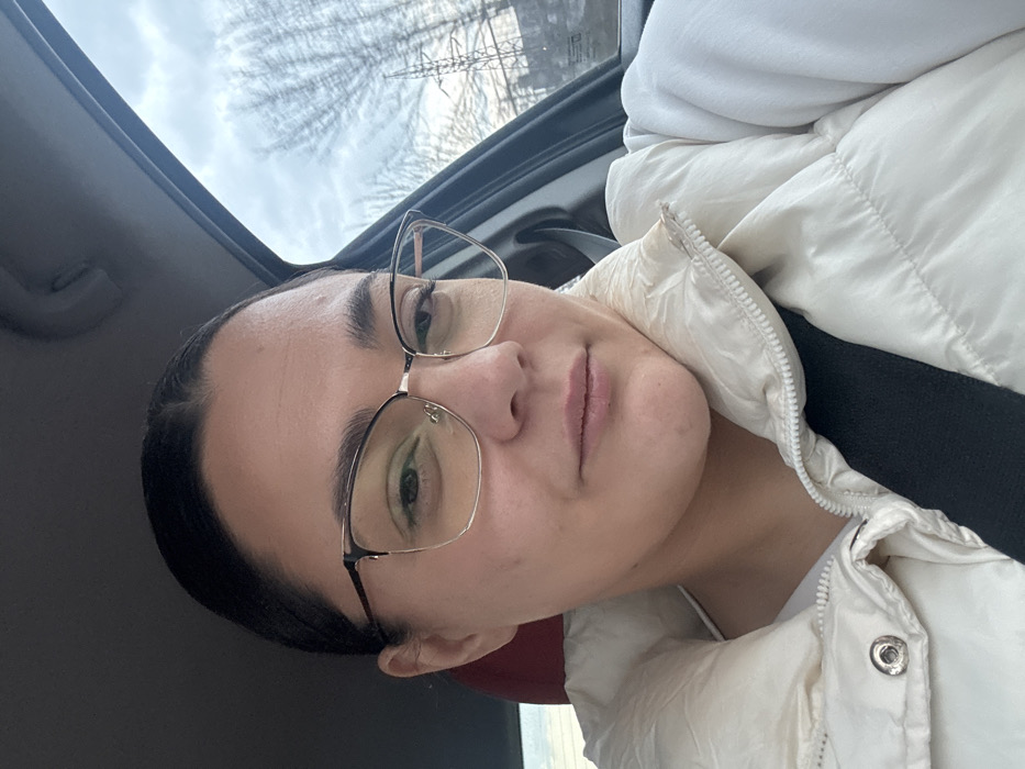 A female individual is depicted in a close-up, waist-up view, seated within a vehicle. She has dark hair pulled back, an oval face, and wears gold-framed cat-eye style glasses. Her expression is neutral with a slight upturn at the corners of her mouth. She is wearing a cream-colored quilted puffer vest over a white long-sleeved garment, secured by a black vehicle seatbelt diagonally across her chest and left shoulder. The vehicle's dark gray interior trim is visible, including the headliner above and part of a red car seat or interior component behind her left shoulder. Through the vehicle's window on the right, an overcast sky with light gray clouds is visible. Bare, leafless trees are in the mid-ground, along with a distinct metal lattice electricity transmission tower. The scene is located in Ravno Pole, Bulgaria.