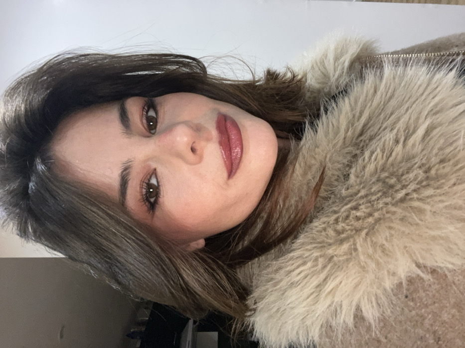 A woman with brown hair and brown eyes gazes into the camera. She wears lipstick and a coat with a furry collar in hues of tan and cream. The background appears to be a neutral, possibly white, surface. Her face is angled slightly, giving a close-up view of her features. The lighting highlights her skin and the texture of the fur collar.