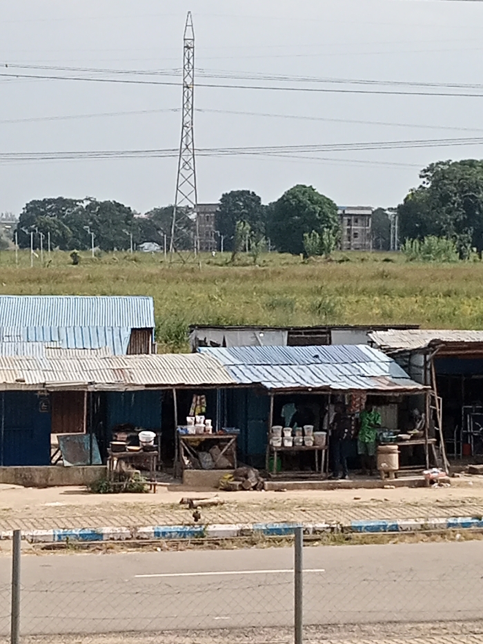 The image depicts a roadside commercial area in Hayin Banki, Nigeria, with a wider landscape in the background under a hazy sky. In the immediate foreground, a grey metal fence partially obscures a paved road with a white dashed line. A concrete curb, painted blue and white, separates the road from a dirt and gravel area where several makeshift stalls are situated. These stalls are constructed from corrugated metal sheets, some painted blue, others galvanized. The central stalls feature two wooden tables displaying various merchandise, including white containers and multiple clear plastic containers with white lids. Two individuals are visible near these stalls: one wearing a dark blue uniform and hat, standing near the right side of a stall, facing left; another in a green garment, standing further right within a stall. A large cylindrical wooden object rests on the ground near the latter individual. Black plastic bags and debris are scattered on the ground. A small dark bird is perched on the ground between the curb and the stalls. Behind the stalls, a wide expanse of dry, green, and brown grassy field extends towards the horizon. A tall, lattice-style power transmission tower stands prominently in the center of this field, with multiple power lines traversing the upper portion of the frame. In the distant background, partially obscured by trees, two multi-story concrete buildings with visible window openings are discernible. The sky above is light grey, indicating hazy conditions.