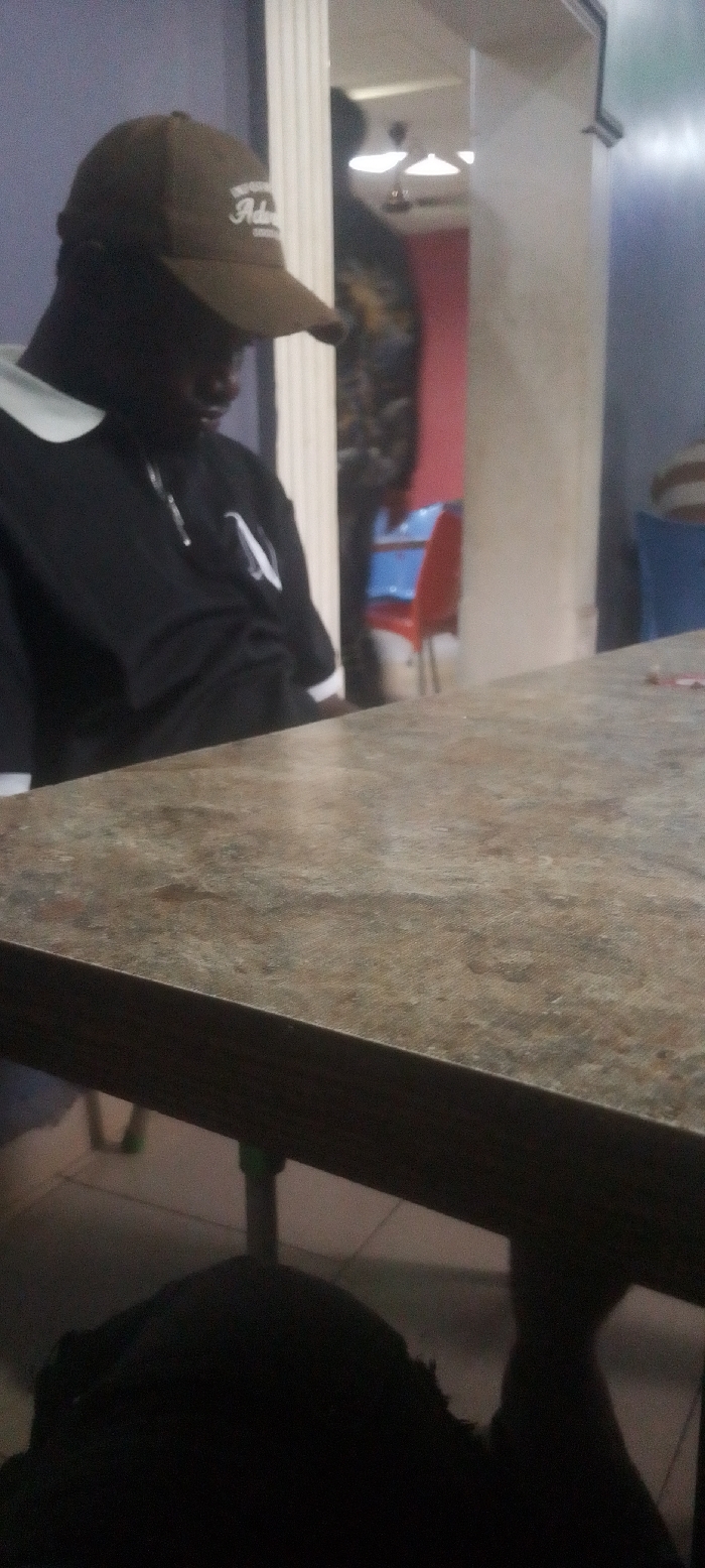 person sitting at a table in what appears to be a restaurant or cafe. The person is wearing a black polo shirt and a brown baseball cap with white lettering. The table is made of wood and has a light brown finish. The person's face is not visible. The person is sitting in a chair, but only their lower body is visible in the image. The background is blurred, but it appears to be a cafe interior. It is possible that the person is waiting for someone, or may have just finished eating. The coordinates provided (latitude: 7.135, longitude: 6.755) correspond to a location in the city of Idah, Nigeria. It is unknown if this image was taken at this exact location.