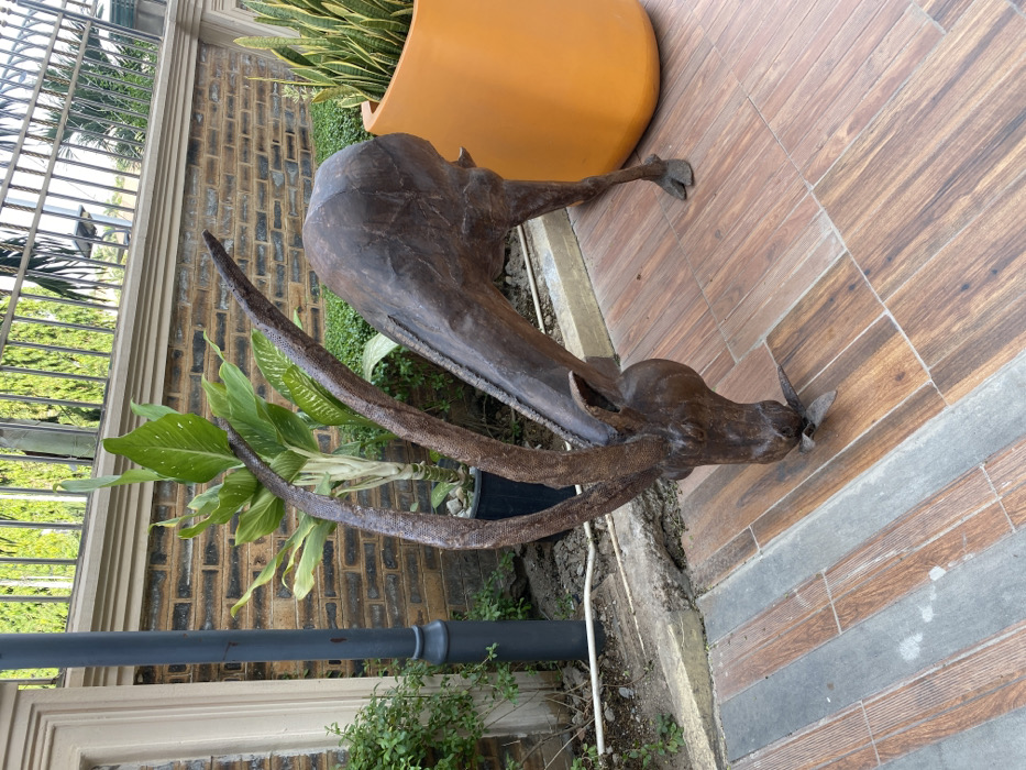 A dark, weathered metal sculpture of an antelope, featuring prominent ridged horns and depicted in a grazing posture with its head lowered, stands on a tiled surface
