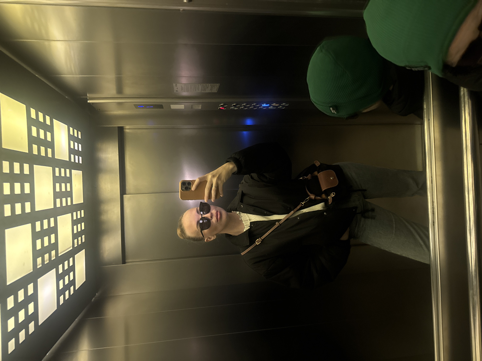 A photo taken inside an elevator. A young woman wearing sunglasses, a black jacket, and jeans is taking a selfie with a smartphone. Another person wearing a green beanie is partially visible in the top right corner of the frame. The elevator interior is metal with a decorative panel featuring square cutouts, illuminated from behind, on the left. Elevator buttons are visible above the woman's head. The location appears to be an urban setting, but without further visual context, specifically locating it within Sirius, Russia, is not possible.