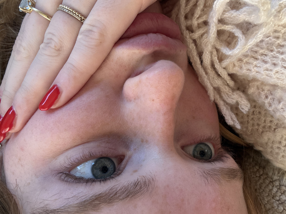 A close-up, oblique photograph captures a person's partially obscured face. The scene is reportedly located in Rosmalen, Netherlands; however, the image itself lacks specific environmental indicators for this location. The subject's right hand, displaying long, oval-shaped fingernails painted a glossy red, is placed across the upper portion of the face, covering the forehead and temple area. Two open blue-grey eyes with visible eyelashes are directed upwards. Fair skin with minor moles or freckles is discernible on the nose and cheek. The bridge and tip of the nose are visible, along with a portion of the subject's pinkish lips. On the right ring finger, two gold-toned rings are worn: one is a narrow, textured band, and the other features a prominent, light-colored, possibly clear, faceted stone set in a raised mounting. Reddish-brown hair is visible along the lower-left edge and beneath the hand. A cream-colored, fringed knit garment is present in the lower right quadrant of the image, appearing to rest against the subject's neck or shoulder.