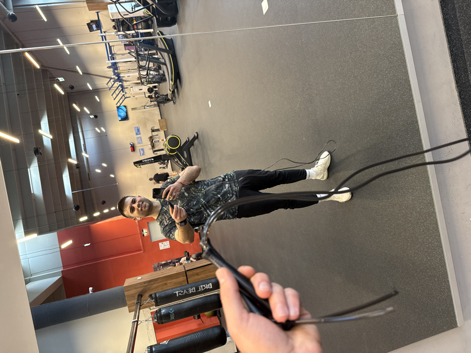 The image displays a mirror selfie taken inside a commercial gym located in Sofia, Bulgaria. The central subject, reflected in a large mirror, is a young adult male with short dark hair, a faint smile, wearing a dark patterned short-sleeved t-shirt, black athletic pants, white socks, and white athletic shoes. He wears white wireless earbuds, a dark smartwatch on his left wrist, and a red bracelet on his right wrist. He holds a black smartphone in his left hand, aiming it towards the mirror, and extends his right index finger. In the immediate foreground, a left hand grips a black jump rope handle, with the rope extending downwards and out of frame. The reflected gym interior features dark grey rubberized flooring and a high ceiling with multiple rectangular fluorescent light fixtures. Visible gym equipment includes black punching bags hanging from a metal rack, two Concept2 rowing machines (one yellow, one black), several curved treadmills, and various weight training apparatus and racks. Architectural elements visible in the reflection include a red wall section with a light-colored door, and a wooden panel wall. A faint reflection of another individual is discernible in the background, near a rowing machine. A digital clock on a distant wall displays "03," and blue signs with white text are mounted on an adjacent wall.