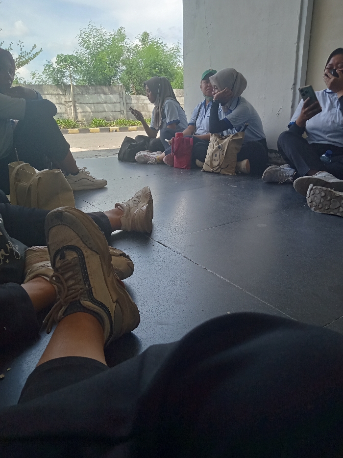 This image depicts six individuals seated on a dark, tiled floor under a covered structure, likely in Sukomoro, Indonesia, with a seventh person's legs visible in the immediate foreground. The perspective is from a low vantage point, looking outwards towards a bright, sunny exterior. From left to right: 1. **Left foreground:** The lower legs and feet of an individual wearing black pants and beige-and-dark-accented sneakers are stretched out towards the bottom-center of the frame. 2. **Far left:** A person, largely obscured, is visible from the waist down, wearing dark pants and white sneakers, seated on the floor. 3. **Left-center:** A female, wearing a light blue short-sleeved polo shirt, dark pants, and a light grey hijab, is seated cross-legged on the floor. She is looking down at a smartphone held in both hands. A dark bag rests beside her left leg. 4. **Mid-center:** A male, wearing a light blue short-sleeved polo shirt and a green cap, is seated on the floor with his right arm resting on his bent knee, looking towards the left. 5. **Right-center:** A female, wearing a light blue short-sleeved polo shirt over a dark long-sleeved undershirt, and a light grey hijab, is seated on the floor with her chin resting on her left hand, looking towards the left. A red thermal flask and a light brown fabric tote bag with a graphic design are positioned next to her right leg. 6. **Far right:** A female, wearing a light blue short-sleeved polo shirt and dark pants, is seated on the floor, possibly cross-legged, holding a smartphone that partially covers her face as she looks downwards. A blue plastic bottle is on the floor near her right leg. The individuals appear to be resting or waiting. The background reveals an outdoor scene with an asphalt or paved surface, a low concrete wall or fence, and dense green trees and foliage under a bright, cloudy sky.