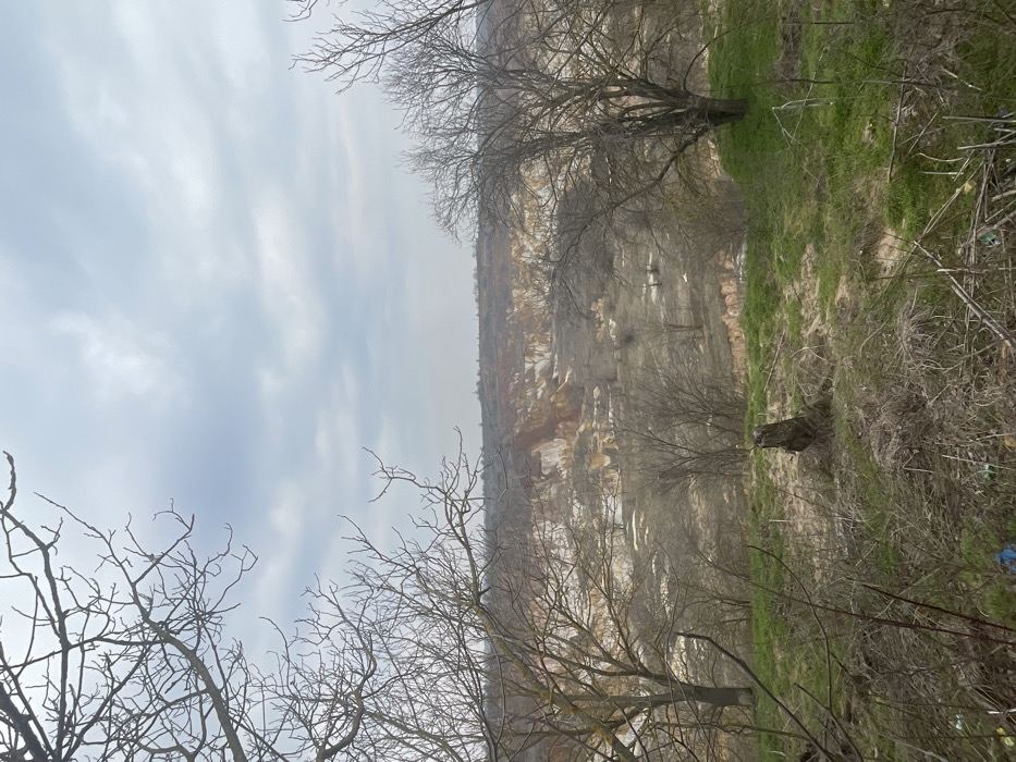The scene depicts an expansive outdoor landscape near Vetovo, Bulgaria, under an overcast sky. The foreground presents a gently sloping area composed of sparse green grass, dry brown vegetation, and exposed soil. A prominent, weathered tree stump stands in the lower-mid foreground. Bare deciduous tree branches, characteristic of late winter or early spring, frame the upper and side portions of the image; larger, leafless trees are positioned on the immediate left and right edges. Evidence of scattered refuse, including blue plastic, is observed in the lower-left foreground. The midground and background reveal a large, open-pit excavation, likely a quarry. The exposed geological formations within this pit display varied coloration, primarily consisting of white, beige, and reddish-brown strata. Sparse, leafless trees and scrub vegetation are distributed across the uneven terrain within the excavation. A relatively flat, higher elevation landmass, also sparsely vegetated, is visible on the distant horizon beneath a uniformly cloudy sky.