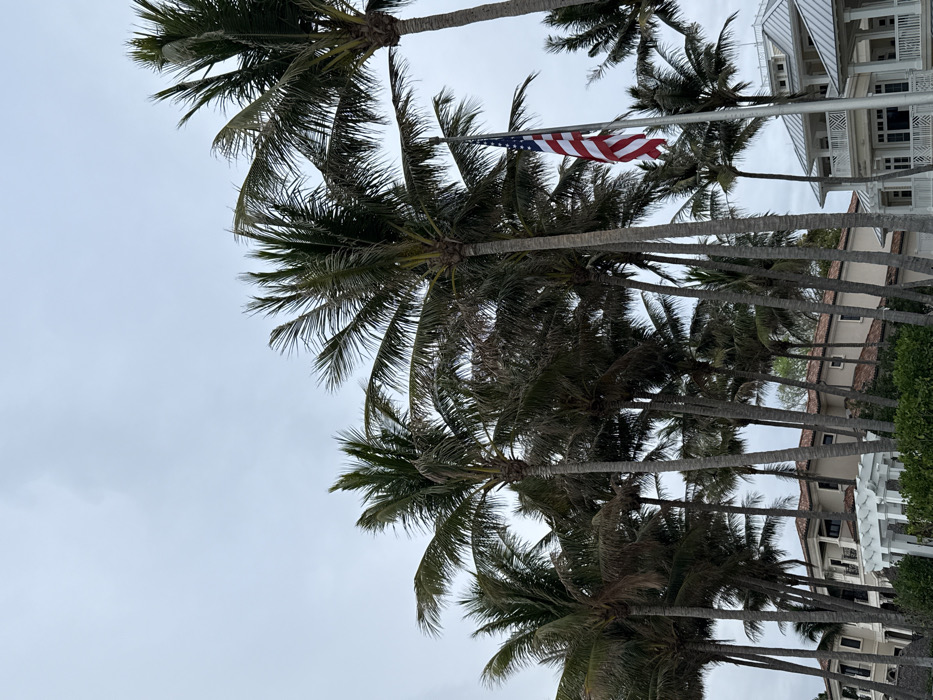 The image depicts an outdoor scene in Naples, United States of America, under an overcast, light grey sky. Numerous tall palm trees with green and partially dried fronds dominate the frame, their slender, dark trunks extending vertically from bottom to top. Amidst the palm trees, on the right side of the image, an American flag is displayed on a silver flagpole, hanging largely unfurled with its red and white stripes and a portion of the blue field with white stars visible. Through and below the palm foliage, two multi-story buildings are observable. The structure on the left features light-colored walls and a terracotta-tiled roof, while the building on the right is white with grey gabled roofs, multiple windows, and balconies with white railings. Green shrubbery is present at the bottom of the scene. No individuals are visible, and no specific actions or interactions are occurring. The environment is tropical, consistent with a coastal residential or resort area.