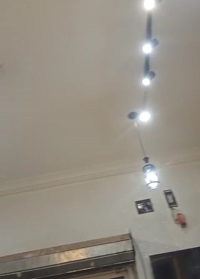 The camera pans across the ceiling of a room, showcasing several light fixtures