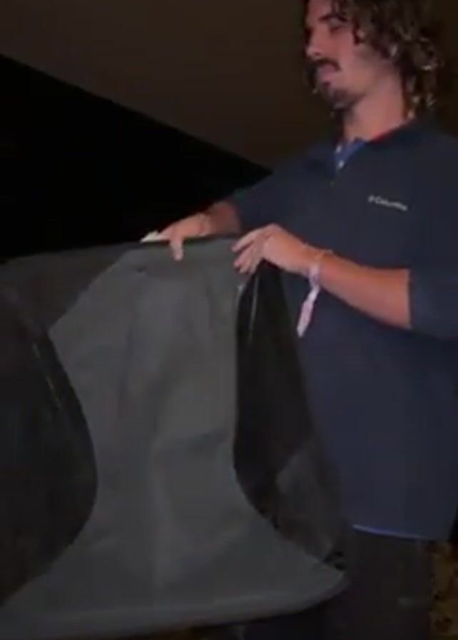 A man with curly hair and a mustache is holding a folding camp chair, inspecting it closely. He's wearing a dark blue long-sleeved shirt, black pants, and has a colorful wristband. The chair is a dark green and black color. The setting appears to be outdoors at night, possibly a campsite. Another person wearing a hooded sweatshirt is sitting in the background. The area is dimly lit, with trees visible further back. There are scattered items on the ground, including what looks like a tarp. The camera angle is low.