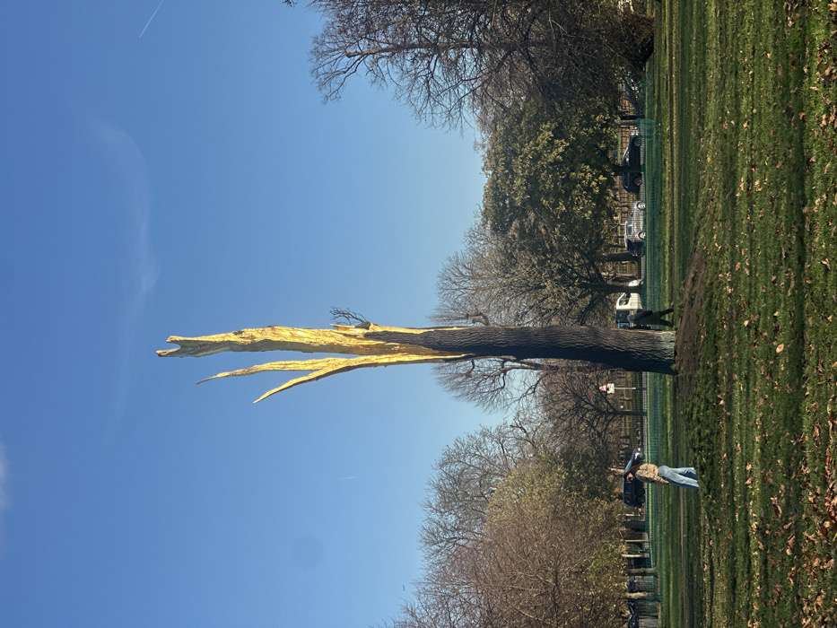 This image depicts a park scene in Regent's Park, Greater London, United Kingdom, under a clear blue sky. The central subject is a tall, dead tree trunk, the upper two-thirds of which are painted or gilded in a bright golden color, with the lower third of the trunk painted dark black. The tree's upper section features several upward-reaching, stripped branch-like structures. The tree stands on a patch of green grass with scattered brown leaves. Two individuals are near the tree's base. One person, wearing a light-colored, patterned jacket and blue jeans, stands facing away from the camera, slightly to the left of the tree, holding an item over their left shoulder. A second person, in dark attire, walks from right to left, partially obscured by a slight rise in the ground at the tree's base. In the background, a line of mostly bare deciduous trees frames a roadway. Vehicles, including cars and a white van, are visible on this road. Traffic signs are also present in the mid-ground. The lighting suggests a clear, sunny day, with the golden portion of the tree brightly illuminated.
