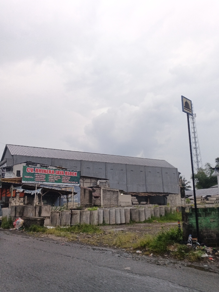 A daytime scene is depicted in Carmen, Philippines, under an overcast sky. The central feature is a large, grey industrial building with a corrugated metal roof and panelized walls, characteristic of a factory or warehouse. Attached to its left side is a green banner sign displaying "CV. BHINEKA JAYA BLOCK" and a list of construction materials. Immediately in front of this building, numerous cylindrical concrete pipes or blocks are stacked in rows. To the left of the main structure, several smaller, informal buildings with sheet metal or tarp roofs are visible. In the foreground, a dark asphalt or dirt road stretches horizontally across the lower portion of the image. The edges of the road are lined with patches of overgrown grass and weeds. A red and white plastic bag filled with refuse is visible on the left side near the road. On the right, a tall black pole ascends, topped by a square yellow sign featuring a dark silhouette of a bell. Behind this sign, a tall, grey, lattice-structure tower, likely for telecommunications, extends upwards. A low, partially green-painted brick wall is present on the far right edge of the frame. No individuals are present, and no specific actions or interactions are observable.