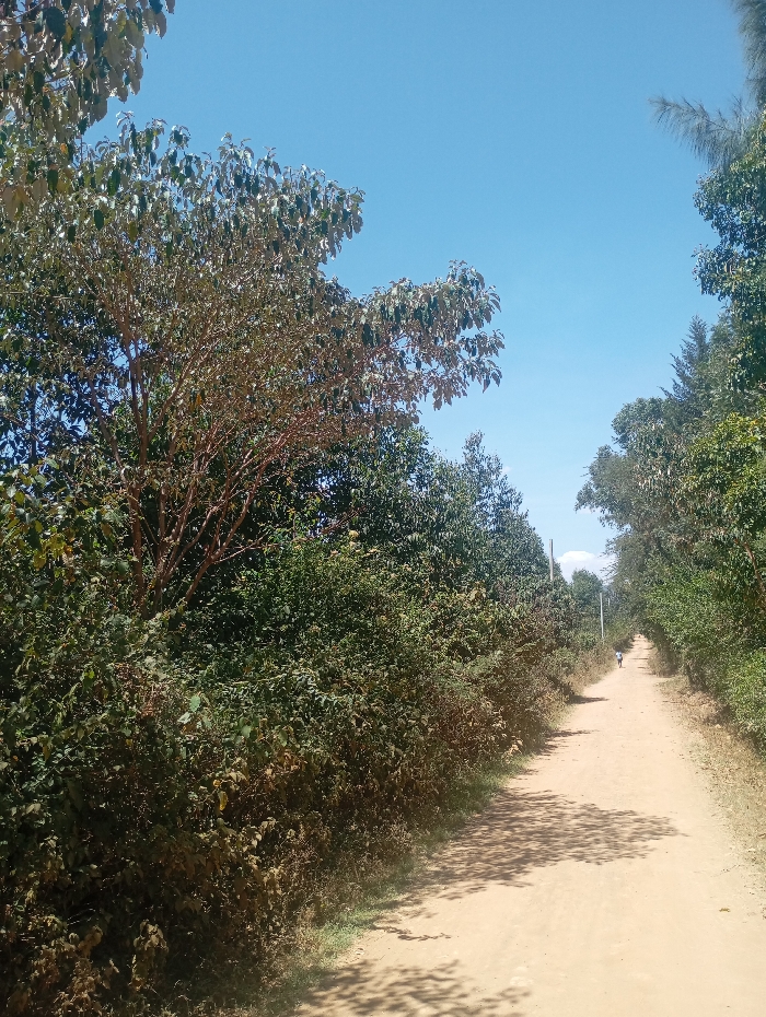 The scene depicts a unpaved dirt road stretching into the distance under a clear, bright blue sky in Mosop ward, Kenya