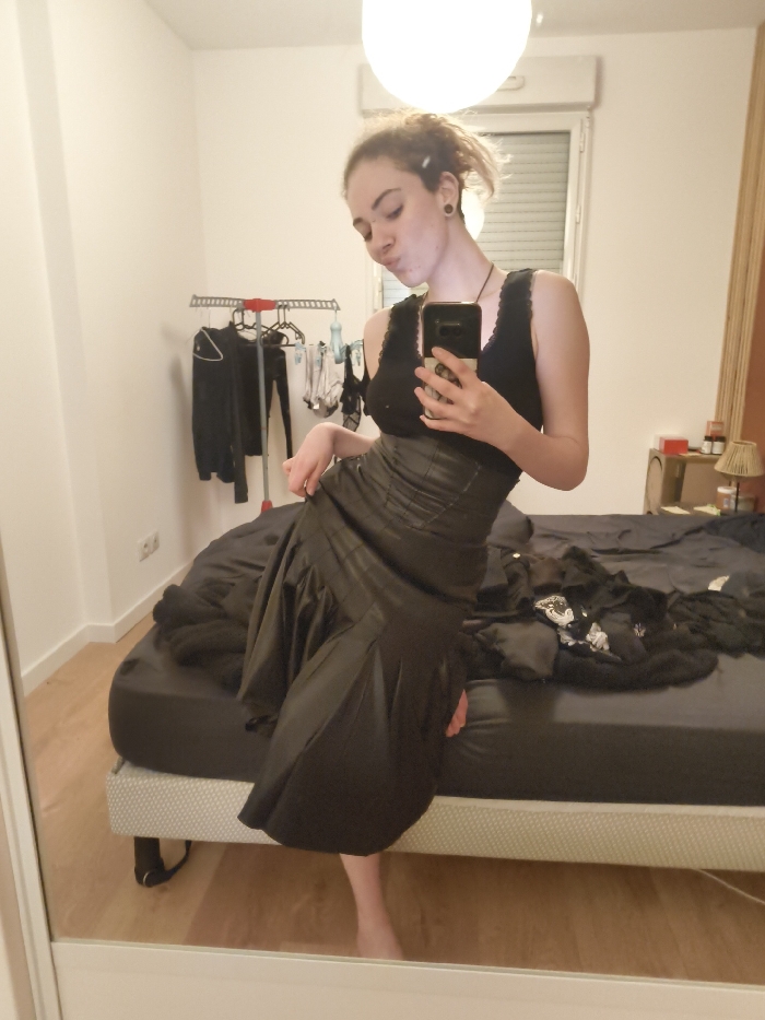 A fair-skinned person takes a mirror selfie in a bedroom. They wear a black sleeveless top and a fitted, high-waisted black skirt with a flared hem. The person poses with pursed lips, holding a phone in their right hand. The room features a bed with a black sheet, a clothing rack with black clothing, and a window with blinds. A bedside table with a lamp is also visible. The floor is made of light wood.