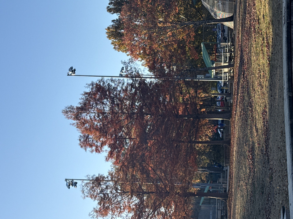 A row of trees with reddish-brown leaves lines a park. Fallen leaves cover the ground. In the background, there are parked cars and picnic tables. Several tall light poles with multiple lights are visible. The sky is clear and blue. The image is taken from a low angle and oriented vertically.