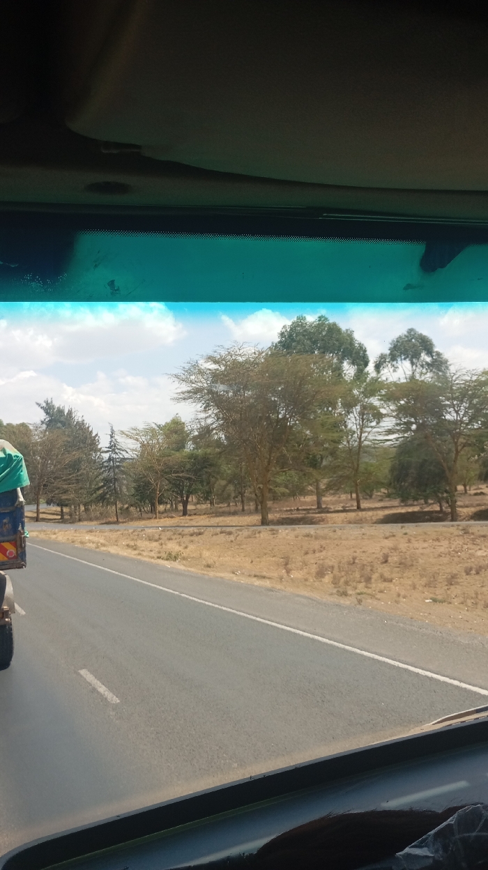 The image depicts an exterior road scene captured from inside a vehicle, with the upper portion showing the vehicle's gray headliner and the top edge of a tinted windshield. The lower portion of the windshield provides a view of an asphalt road in Viwandani ward, Kenya, extending into the background. A single white dashed line marks the center of the visible lane, indicating a two-lane road. To the immediate left, the rear section of a separate vehicle is partially visible. This vehicle features a blue body, a partially visible wheel, and a green tarp covering a payload. A person wearing a green garment is visible above the blue bodywork, positioned in or on the vehicle. Red and white reflective markings are present on the rear of this vehicle. To the right of the road, the shoulder is characterized by dry, light brown soil and sparse, low-lying vegetation. Beyond the shoulder, a dense line of trees of varying heights and foliage types (including some with lighter, possibly yellowish-green leaves and others appearing darker green) stretches into the distance, suggesting a wooded or semi-arid environment. The sky above is partly cloudy with significant blue patches.