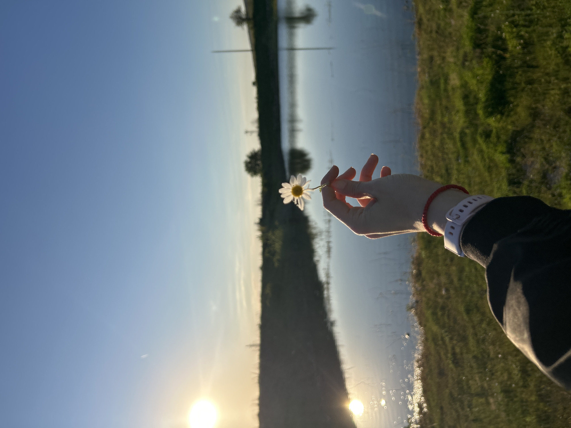 A hand holding a daisy against a backdrop of a landscape during sunset. The location is most likely not in Vaskovo, Bulgaria, as the environment consists of a body of water (lake or river) with vegetation on the shoreline and distant objects (trees or powerlines), suggesting a rural or suburban area, not a city.