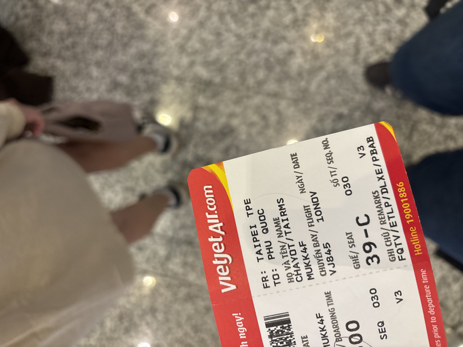 VietjetAir boarding pass. The flight is from Taipei (TPE) to Phu Quoc. The passenger's name is Chayot Tairms. The flight number is VJ845, departing on November 10th. The seat number is 39-C, and the sequence number is 030. The boarding pass features the VietjetAir logo and includes a hotline number, 19001886. Additional information includes the remark, "FQTV/ETLP/DLXE/PBAB." Parts of two people's legs are visible behind the ticket.