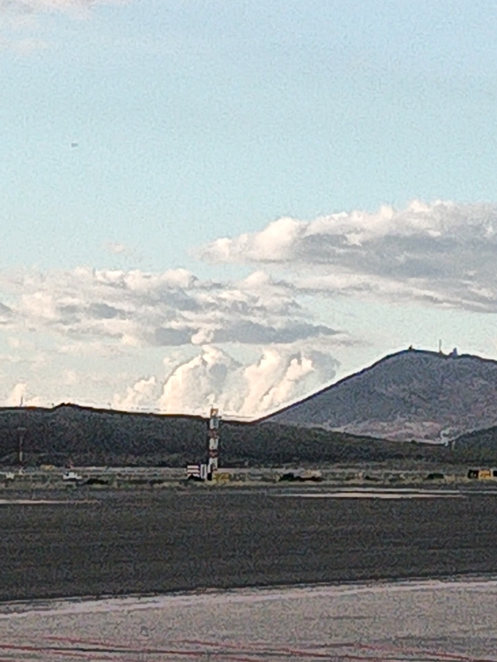 The image presents an exterior view of an airport environment, located within or immediately adjacent to Ingenio, Spain, characteristic of Gran Canaria Airport. The foreground consists of a dark grey asphalt surface, resembling a runway or taxiway, marked by faint red and white lines at the lower left edge. A strip of lighter, vegetated ground separates this surface from the backdrop. In the midground, a distinct white tower with red horizontal stripes, likely an airfield lighting or navigation aid, stands slightly left of center. The background is dominated by two dark, verdant mountains, with the taller, rightmost peak featuring several dark, slender communication towers. The sky is a light blue, sparsely populated with white and grey cumulus clouds, and a small, dark, elongated object, possibly an aircraft, is visible in the upper left quadrant. No people, discernible actions, or interactions are present in the static scene.