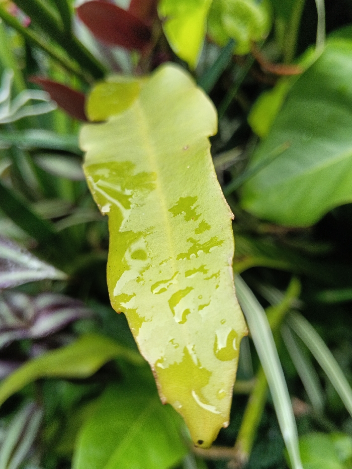 A light green leaf with water droplets stands out against a backdrop of various green plants. The leaf has a slightly jagged edge and a somewhat elongated shape. Some leaves have a reddish hue, and slender grass-like plants are visible. Other broad green leaves are also present, creating a lush and textured botanical scene.